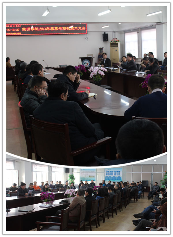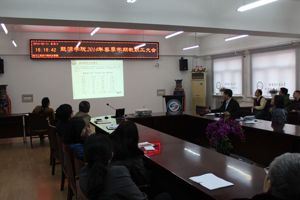 2014年3月11日下午15:00,tyc7111cc太阳成集团在动力楼619会议室召开全院教职工大会,布置新学期工作。院长赵广播,院党委书记张桂芬,副院长李炳熙、王洪杰、陈浮、党委副书记苑颖及tyc7111cc太阳成集团全体教工参加了本次会议。