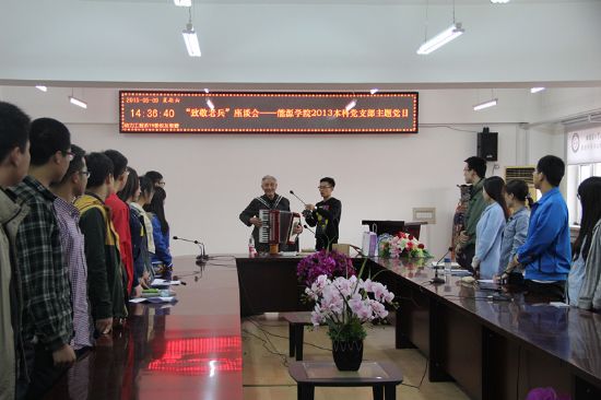 座谈会接近尾声时,党支部书记王妍同学做总结发言,号召党支部全体成员学习老战士崇高的爱国主义情怀和不屈不挠的革命精神,并代表党支部向老战士献上了精心准备的纪念品。最后,老战士用自己心爱的手风琴演奏了一曲革命歌曲,当演奏到没有共产党就没有新中国时,引起了全场同学的共鸣,在激昂的合唱歌声中,座谈会圆满结束。