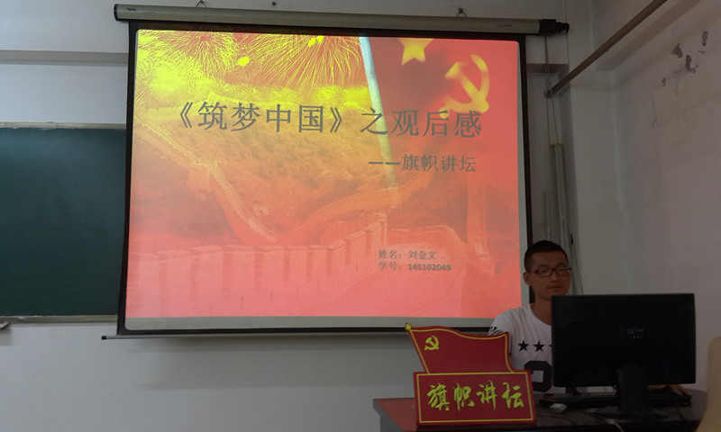 讲坛现场气氛活跃,同志们认真倾听,积极发言。讲坛以《筑梦中国》之风雨如磬的观后感为发起点,对中国梦、中华民族复兴等话题进行了深入的讨论。明确了当代大学生党员的使命,牢记习总书记讲话精神,为实现中华民族伟大复兴而奋斗终生!