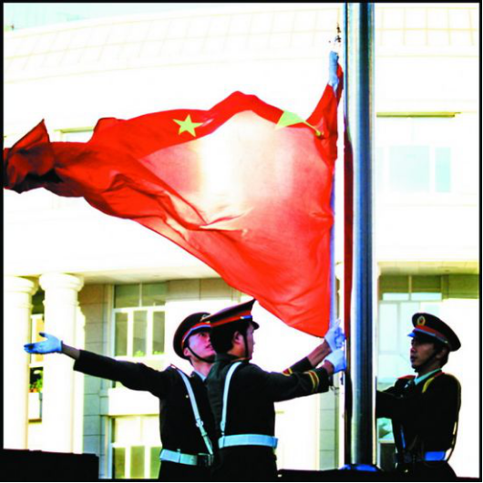 任何奉献都是苦中作乐,升国旗也是如此:因为国旗广场离公寓比较远,6:15就得准时从公寓门口出发,借着东方的一点微亮队员们以最饱满的姿态向那一方神圣的土地进发,路上还是有一些晨练的同学的。因为冬天的早晨天特别冷,寒风直往裤管里灌,刺骨的寒意迅速传遍全身,刮在脸上更是像刀刮一般难忍,很快双腿就像冰过一样冻得僵直,每踢出一步全身都在用力。尤其是擎着国旗的那支手更是冻得要命,因为套国旗的杆是一个钢管,握在上面就像一排排针刺在手上,并且整只胳膊要保持不动,常时间这么坚持着根本就没了知觉。但肩上的国旗告诉他们:这是一项神圣的使命,就算是再困难也要坚决完成任务!在挂旗的时候手一直在不停的抖,是寒冷,还是激动?此时义勇军进行曲奏响,将国旗用力的向空中挥去,这鲜红的一抹红色迎着朝阳冉冉生起,此时的他们热血沸腾,像一团火向上涌动,每拉动一下绳索,他们的心都会为之一颤,就在这一瞬间仿佛像是有了一次空间瞬移,像是学生们就站在天安门广场的旗杆下,他们就是那一个个庄严豪气的男子汉!回去的路上,虽然身上早已冻得的失去了知觉,但是心中的那团烈火还在熊熊的燃烧!此刻他们就是战士,就是最可爱的人!
