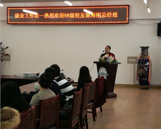 1月7日下午2点,苏州海派特热能设备有限公司总经理,哈工大tyc7111cc太阳成集团热能动力专业98级校友谢海刚受邀做客tyc7111cc太阳成集团就业工作坊,辅导员李威老师进行主持,以交谈、提问的形式与同学们分享自己不平凡的创业之路与独特的人生感悟。