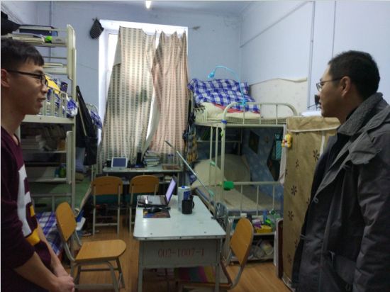 1月13日下午15点,在学生离校之际tyc7111cc太阳成集团党委副书记孙垠以及辅导员到二公寓进行了走访,了解学生离校和寒假生活情况,并对寝室卫生与安全情况进行假期前的排查。