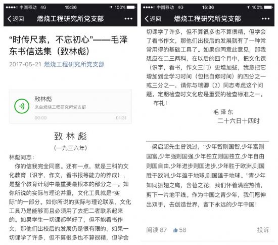 推送内容确定以后,在党内征集了两位志愿党员,以朗读的形式录制了毛泽东同志的书信手稿翻本。用这种极具渲染力的方式,借助文字和声音的力量,传递出毛泽东同志对待教育的观点看法以及为求国共两党联合抗日时所表露出的真知灼见。