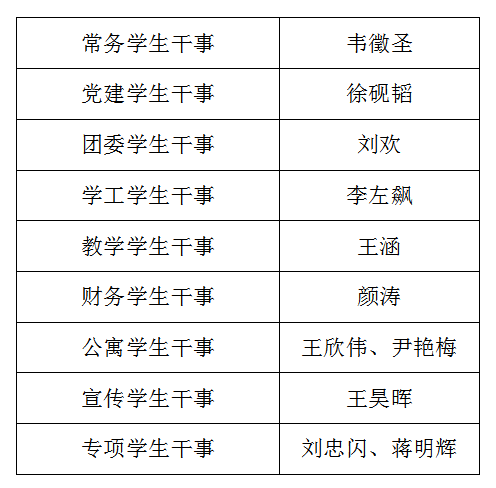 前期经学生自主申报和学院集中面试,现将选拔结果和工作分工公示如下,聘期:2017年9月-2018年2月。聘期内学生干事要严格要求自我,认真对待年级工作,热心服务身边同学,原则上不得无故中途退出。如因不可抗原因不能继续工作,应及时向学院提出书面辞聘申请。考核合格的学生干事将颁发荣誉证书和纪念奖章。