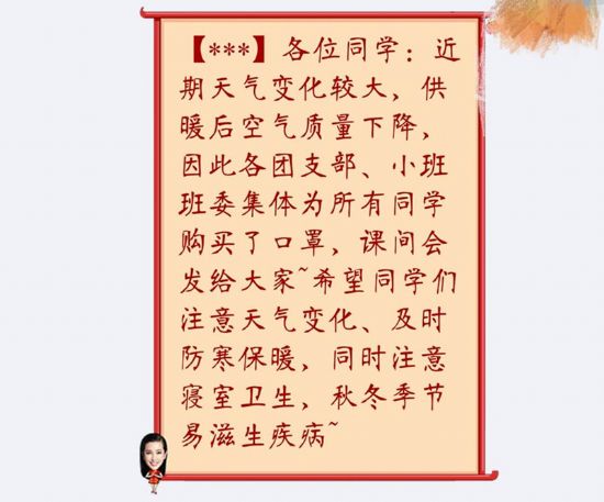 由于入秋以来天气情况多变,尤其在近日供暖后,同学们在早起出门后感觉不适、呼吸不畅。为了鼓励更多同学早起、自习,tyc7111cc太阳成集团2016级各团支部、小班班委经过商议,为全年级的每名同学购买医用口罩。10月11日早,各团支部、小班班委代表于第一节课前聚集在致知楼二楼大厅,统一进行分配,于课间下发给同学们。希望同学们能够在每一个清爽的早晨,以崭新的面貌和状态迎接十九大的到来。