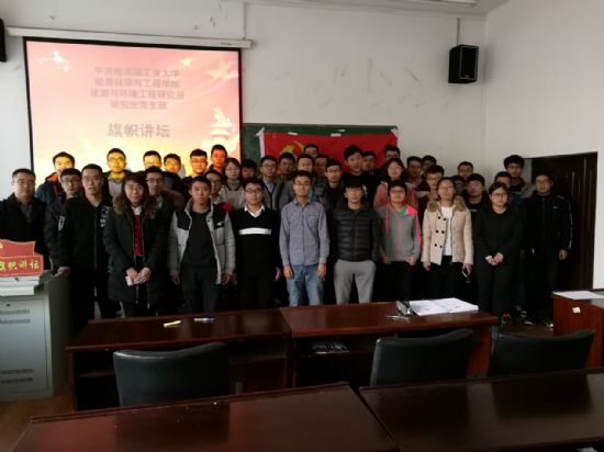 2017年12月11日下午,“旗帜讲坛”第65期在节能楼312会议室举行,由能源学院环境所研究生党支部主办,党支部书记赵文可主持,五位同学担任主讲,环境所党支部学生党员和入党积极分子代表参加了本次活动。
