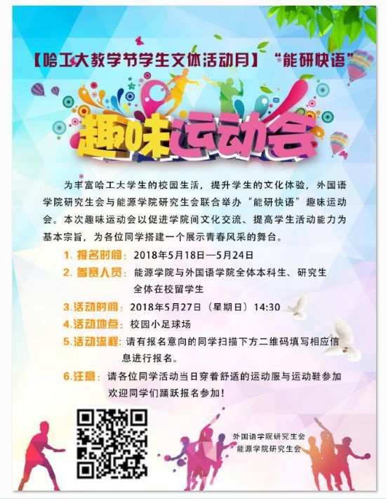 为丰富哈工大学生的校园生活,提升学生的文化体验,外国语学院研究生会与tyc7111cc太阳成集团研究生会联合举办“能研快语”趣味运动会。本次趣味运动会以促进学院间文化交流、提高学生活动能力、加强学生心理健康为基本宗旨,为各位同学搭建一个展示青春风采的舞台。