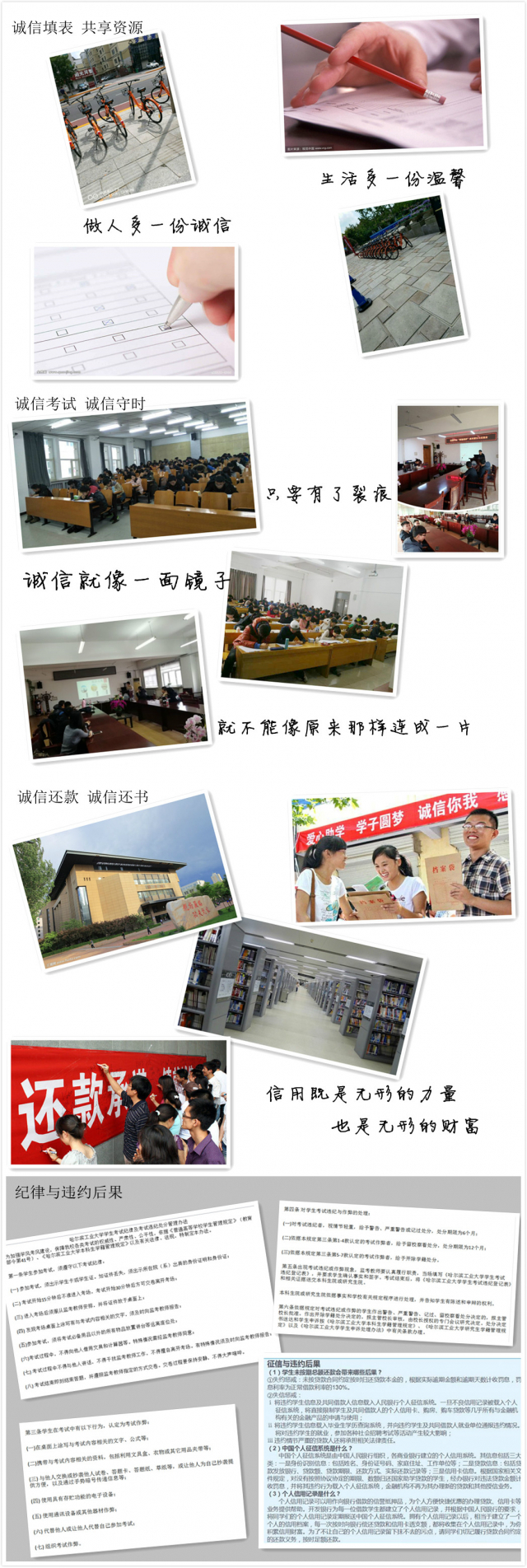并且在公寓大厅墙壁张贴诚信主题展板,关于“诚信考试、诚信守时、诚信填表、诚信还款、诚信还书”等,以及“太阳成tyc7111cc学生考试纪律及违纪处分管理办法”等主题展板。