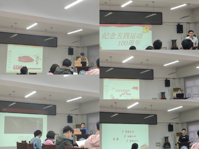 首先吴灏泓同志为大家介绍了五四发展史,让大家对五四运动有个初步了解。接下来何宇桐同志从五四运动的历史、意义以及对当代青年的启示三方面,进一步地让大家认识五四运动,学习五四精神。杨柳同志着重介绍五四精神和新时代青年的历史使命,号召我们青年勇于担当,争做新时代的奋斗者。李博文同志将五四运动的历史、经过,五四精神及新时代青年的使命结合起来,为我们梳理知识脉络。最后陈志国同志通过以图片展示,演讲为旁白的方式,富有震撼力地向大家讲述五四运动那一天,五四运动以来那些爱国青年以及具有纪念意义的那些时刻,希望新时代中国青年积极拥抱新时代、奋进新时代,让青春在为祖国、为人民、为民族、为人类的奉献中焕发出更加绚丽的光彩。