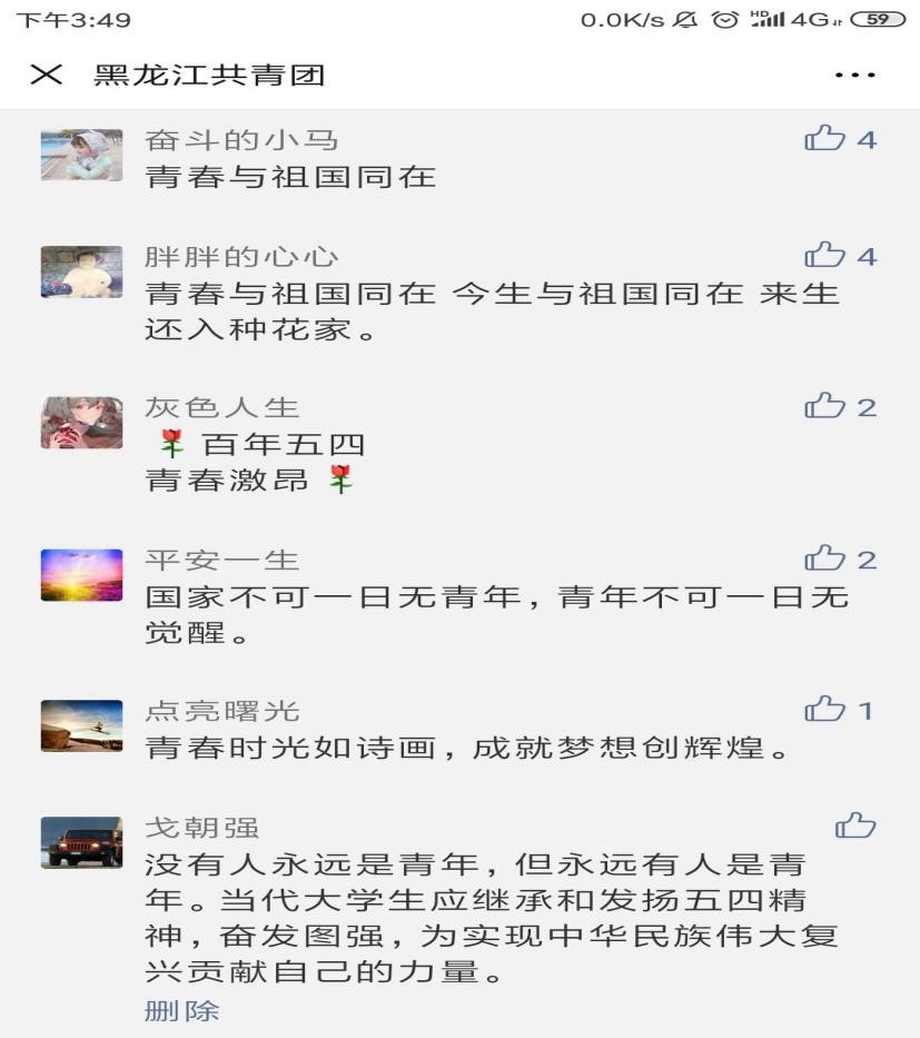 传播党的声音,激发青春力量。1602004班团支部依托新媒体平台,学习宣传贯彻习近平新时代中国特色社会主义思想,表达“奋勇建功新时代”的心声!全体同学在黑龙江共青团微信公众号上写下了对五四精神的领悟,传播分享了自己的独特体会。