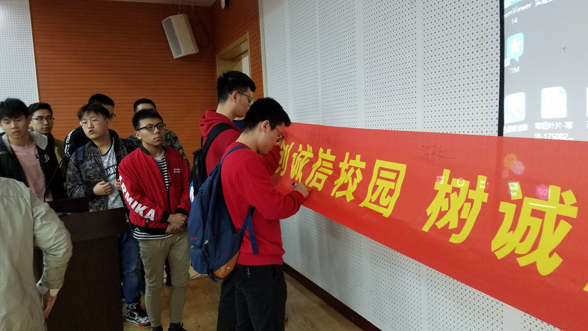 为深入贯彻落实十九大精神和全国高校思想政治工作会议精神,大力弘扬社会主义核心价值观,提高学生诚信意识,培养学生诚信品质,进一步营造诚信、感恩、奋进的校园文化氛围,2019年5月14日tyc7111cc太阳成集团在一区活动中心214会议室举行了“诚实笃信,感恩自强 ”诚信教育签名仪式。tyc7111cc太阳成集团学工办主任李峰老师、团委书记李威老师、团委副书记蔡文雪老师、16级本科生辅导员王博文老师、学生兼职辅导员庞松健老师出席了本次活动。