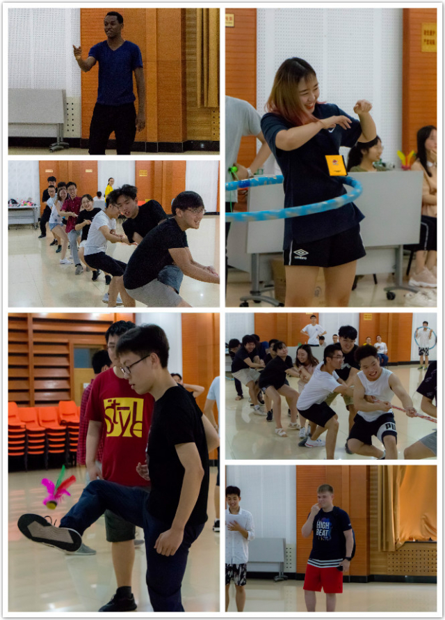 本次活动共5项比赛,分别为你画我猜、铁人四项、眼色游戏、踢毽子和拔河,参加活动的同学分为5个小组展开竞赛。在你画我猜活动中,组员们根据裁判所给的提示信息,通过肢体语言生动形象地为搭档描述信息,大家充分调动思维,发挥想象,场上气氛十分活跃,全程笑声不断,该项目深受中外同学喜欢。而在铁人四项活动中,大家争分夺秒,团结协作,争做第一。