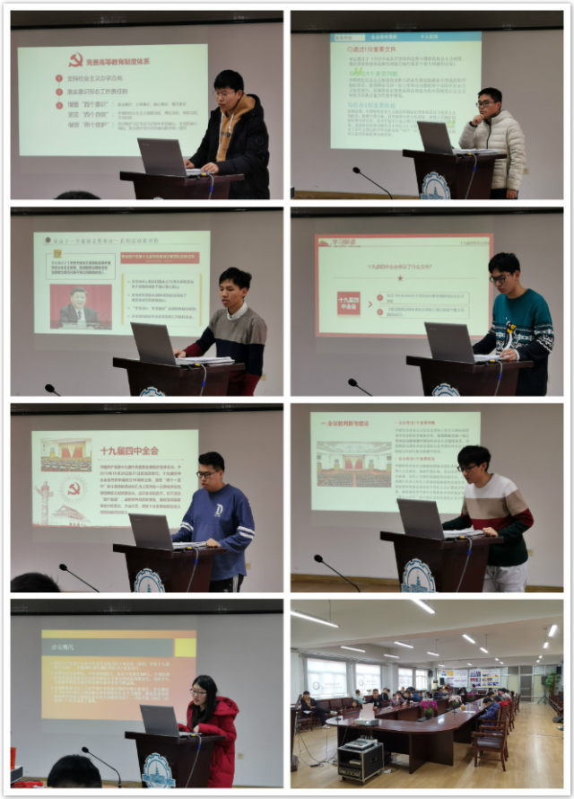 会上,卢国鹏同学为大家简要介绍了十九届四中全会的内容,包括审议了一个重磅文件、三个重要判断、“十三个坚持”等,并讲述了十九届四中全会的启示;张涛同学从全会精神理解及个人实践出发,强调我们要积极学习及践行全会精神,用实践成果来印证制度的优越性;侯凌霄同学为大家介绍了多位学者对十九届四中全会的解读,重点阐述了推进国家治理体系和治理能力现代化;姚港同学以高等教育为切入点,为大家讲解了全会上关于加快推进高等教育治理体系和治理能力现代化建设的若干问题;袁铭谦同学重点介绍了会议通过的重要文件即《中共中央关于坚持和完善中国特色社会主义制度、推进国家治理体系和治理能力现代化若干重大问题的决定》,说明了其重要意义和承载的重点任务;赵欣蕾和孙安泰同学全面地介绍了大会的各项决议及判断,并讲述了自己的体悟。