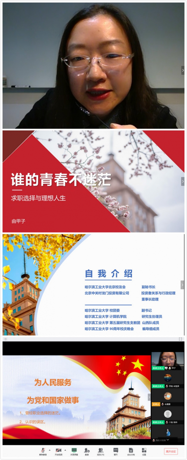 活动伊始,主持人余潇潇同学对由甲子老师进行了简要介绍。接着由老师从自身青春时期的迷茫讲起,分享了她在职业选择、大学恋爱及专业课方面的纠结、思量与选择。紧接着,由老师分享了她身边熟悉的工大学长——刘志硕、熊焰的人生经历,以他们的亲身经历为同学们分享处理相关问题的经验方法。由老师还以一些伟人为例,更为深刻的分析青春时期我们可能陷入的迷茫,并鼓励我们向他们学习。再然后,由老师针对青春期关于求职选择与理想人生的问题提出了一些有用的解决方法,同学们对此感触颇深。演讲最后,由老师以“为人民服务,为党和国家做事”为方向指导同学们探索自身的发展方向和目标。经过由老师的分享,同学们对如何应对和解决现下的课业、职业、人生发展、恋爱方面的青春迷茫有了较清晰的思路与方法。