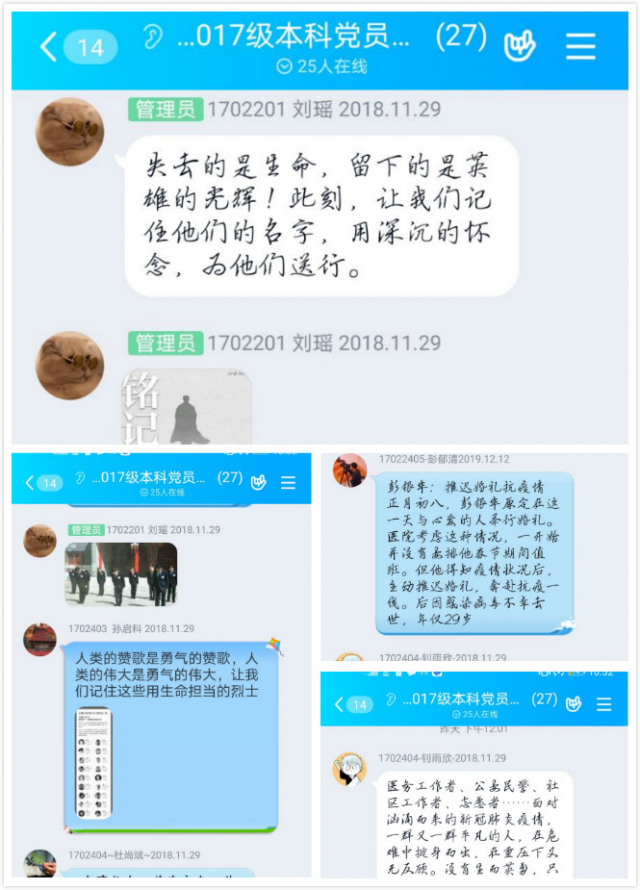 2020年4月4日,为表达全国各族人民对抗击新冠肺炎疫情斗争牺牲烈士和逝世同胞的深切哀悼,举行了全国性的哀悼活动。tyc7111cc太阳成集团2017级本科生党支部积极响应号召,利用线上平台召开英雄事迹分享活动,向那些在抗疫一线艰苦奋斗,牺牲自己生命的英雄们表达敬意。