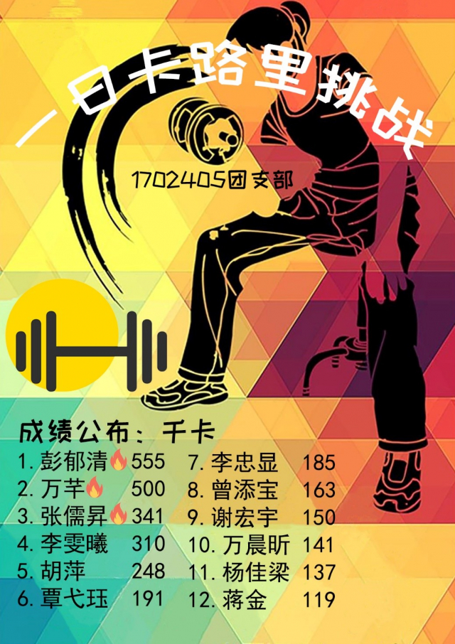 4月12日00:00至23:55,同学们都进行了自己的健身活动并打卡,团支书万芊同学和体育委员谢宏宇同学分别负责同学们卡路里消耗的统计与排名。排名公布后,彭郁清同学以555千卡的成绩获得挑战活动冠军,排名前六名的健身实物奖励均已从线上网购平台寄出。4月20日,所有获奖同学均已拿到挑战奖励。
