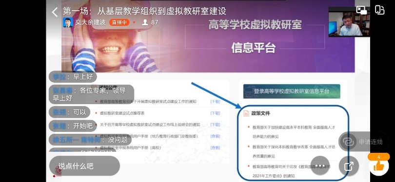 上海交通大学余建波教授对教育“新基建”中的基层教学组织,三类虚拟教研室的建设要领,一流专业、一流课程、优秀教材、教学团队、教学名师与虚拟教研室的关系以及学校如何构建虚拟教研室的政策保障制度做了精彩的报告。会议结束,各位老师就虚拟教研室建设相关问题展开了激烈的讨论。