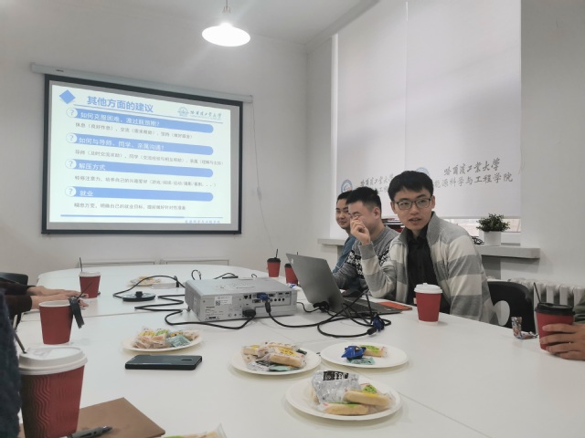 交流会上,黄健同学首先分享了自己科研上的心路历程,从确定课题方向,到课题渐入佳境,从研究过程中状况百出,到最后冰解的破,收获成果。黄健用亲身经历向到场的师弟师妹们传授科研技巧和学习心得,告诉他们应如何规划好硕博时期自己的科研生活。最后,黄健针对在场同学提出的课题前沿问题以及如何缓解科研和生活中面临的压力等进行了详细解答。