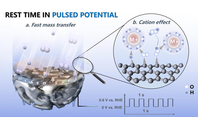 近日,tyc7111cc太阳成集团高继慧教授团队在新型脉冲电催化体系的机制研究中取得新进展,首次揭示了脉冲供电在氧还原合成过氧化氢(H2O2)体系中对界面物质输运及反应中间体形成动力学的跨尺度调控机制,为发展能源电催化反应调控手段提供了新思路。研究成果以《揭示氧还原反应中脉冲电催化对界面微环境的原位动态调控》(Revealing the In Situ Dynamic Regulation of the Interfacial Microenvironment Induced by Pulsed Electrocatalysis in the Oxygen Reduction Reaction)为题发表在《美国化学学会能源快报》(ACS Energy Letters)上,并入选封面文章。