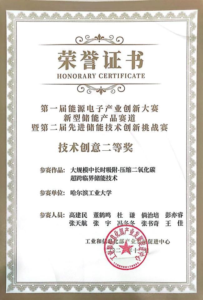 大赛共征集507项参数作品,经初赛评比共300项进入决赛。tyc7111cc太阳成集团项目“大规模中长时吸附-压缩二氧化碳超跨临界储能技术”在物理储能分组16项技术中进入前3名,获得创新创意类分赛道技术创意二等奖。
