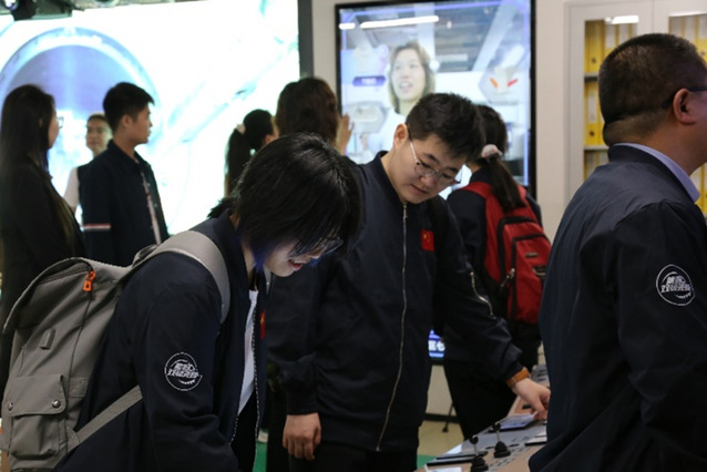在大亚湾核能科技馆模拟控制系统前参观和操作