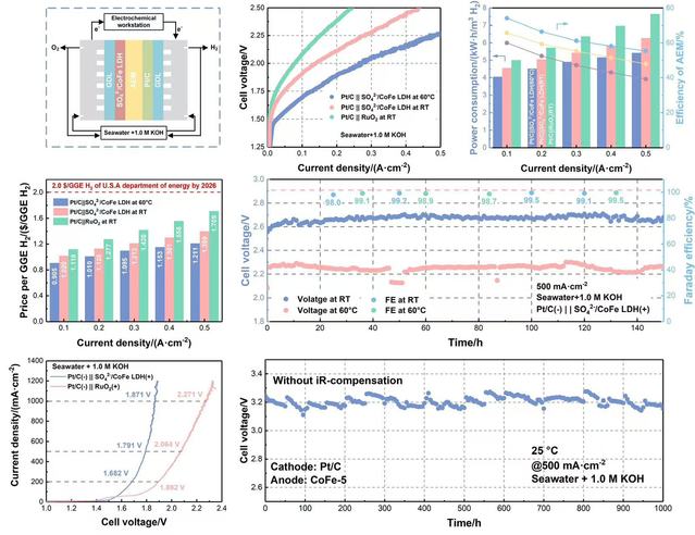为此,团队开发了一种可行的策略,通过同时氧化硫脲和CoFe来形成插层LDH结构(SO42-/CoFe LDH),实现优异的海水电解性能(265.2 mV@100 mA·cm-2)和卓越的稳定性(1000 h @500 mA·cm-2)。原位拉曼光谱和选区电子衍射结果表明CoFe LDH和SO42-同时生成,并且SO42-会插入LDH层间。层间的SO42-增强了CoFe LDH的OER活性和OH-吸附选择性,抑制了CoFe LDH的腐蚀倾向。DFT计算进一步证实,SO42-的插入抑制了Cl-吸附,并强化了Co-O键的强度。海水AEM电解槽(SO42-/CoFe LDH || Pt/C)实现了高活性(2.264 V@500 mA·cm-2)和稳定运行(150 h@500 mA·cm-2),工作效率高达55.0%,每GGE H2的价格低至1.211美元。