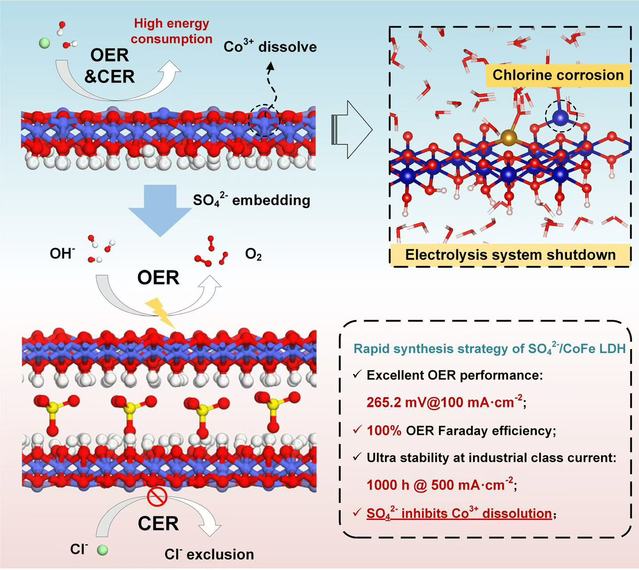 (周伟/文)近日,我院高继慧教授团队周伟副教授等在海水直接电解制氢催化材料设计方面取得新进展。团队提出了一种新型阴离子插层层状双氢氧化物制备方法,实现了高稳定海水直接电解,为发展新型海水制氢关键材料提供了借鉴。相关成果以《利用激活电位重合实现稳定海水直接电解》(Taking advantage of activation potential coincidence to unlock stable direct seawater splitting)为题发表在《先进功能材料》(Advanced Functional Materials,IF=18.5)上。