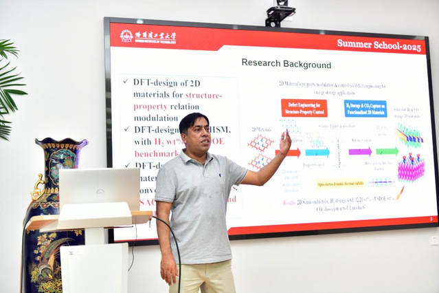 开幕式上,王宇教授首先介绍了2025年哈工大国际暑期学校的进展,为暑期学校送上殷切寄语,希望学员们能够在本次暑期学校中积极探讨交流、合作创新,鼓励大家勇于探索,在活动中收获新知识,结识新朋友。齐宏副院长、青年教师乐古为开幕式致辞,Iarkov Andrei代表学员发言。Rafique Muhammad副研究员围绕 “基于低维材料的 CO₂捕获、转化与利用”的主题为本次暑期学校开启了首场讲座。