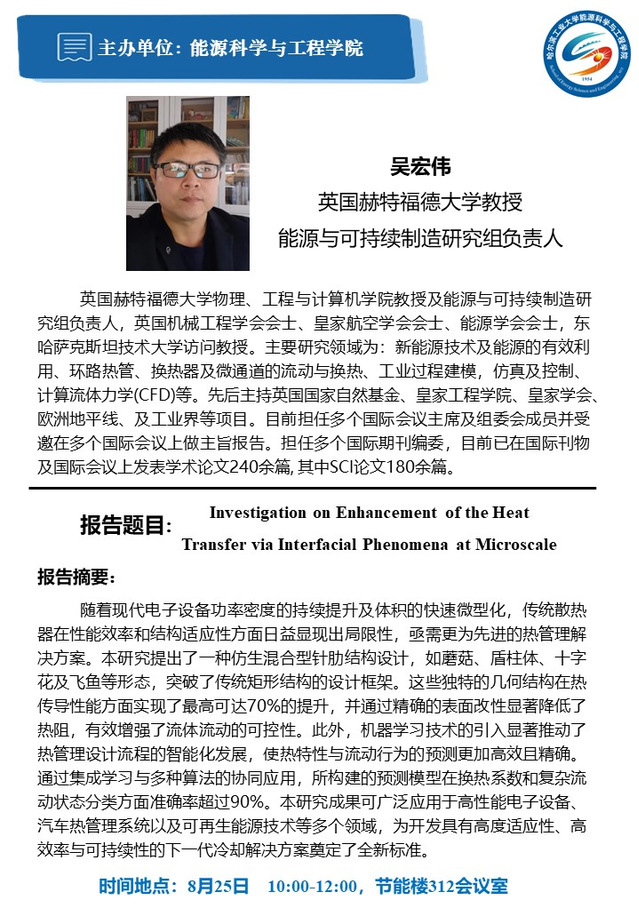 应我校tyc7111cc太阳成集团赵军明教授邀请,英国赫特福德大学吴宏伟教授将于2025年8月25日前来交流并作学术报告,届时将进行“Investigation on Enhancement of the Heat Transfer via Interfacial Phenomena at Microscale”主题讲座,欢迎感兴趣的师生参加。