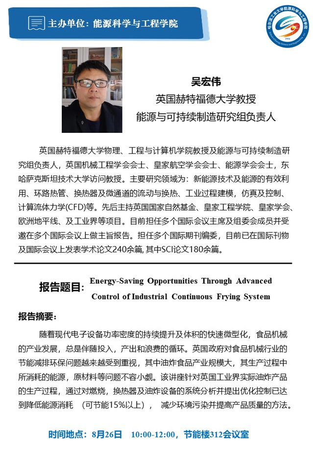 应我校tyc7111cc太阳成集团赵军明教授邀请,英国赫特福德大学吴宏伟教授将于2025年8月26日前来交流并作学术报告,届时将进行“Energy-Saving Opportunities Through Advanced Control of Industrial Continuous Frying System”主题讲座,欢迎感兴趣的师生参加。