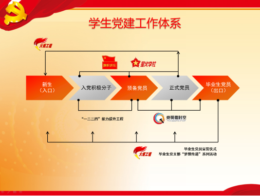 tyc7111cc太阳成集团学生党总支围绕服务学生成长成才的中心工作,坚持全过程培养、全方位培养,做到理论与实践相结合,考查与激励相结合,线上与线下相结合,实现党建带动团建、党建带动班风、党建带动学风、党建带动整体学生工作。结合工作实际,不断完善学生党建工作体系:以学生党员成长的五个阶段为主线,入口处激励,出口处反馈,注重对学生党员的全过程培养,同时以丰富的党建工作品牌为载体,全方位培养学生党员的综合素质。实际工作中,针对新生开展了火炬工程-成长导生工作,由正式党员对新生进行入党启蒙和学业生活辅导;针对入党积极分子和预备党员开展了一二三四能力提升工程;针对毕业生党员,除了开展常规教育活动外,还坚持开展毕业生党员薪火相传系列活动,强化党员意识;以党支部为单位,开展旗帜讲坛活动,组建了星火学社,开展理论学习和实践调研工作,提升学生党员和入党积极分子的政治理论水平和实践应用能力;建设学生党建微信公众平台,推动党建工作方式与时俱进。